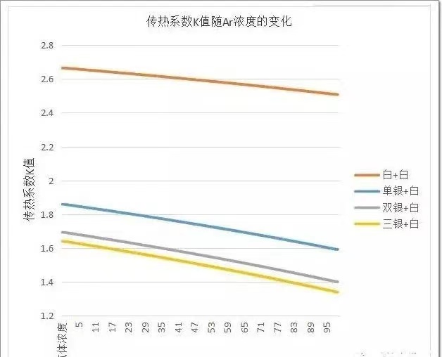 由圖4可見(jiàn),隨氬氣含量的增加,其傳熱系數(shù)顯著降低。以單銀+白玻+白玻為例,氬氣含量從0-100%,傳熱系數(shù)從1.36下降到1.17;三銀+白玻+白玻,傳熱系數(shù)從1.24下降到1.02。