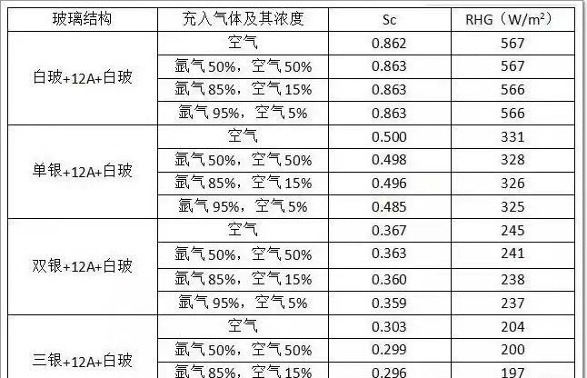 由本文的分析可見(jiàn),中空玻璃腔體是否充氬氣以及氬氣的含量,對(duì)傳熱系數(shù)K值影響較大,對(duì)遮陽(yáng)系數(shù)Sc和相對(duì)增熱RHG有一定影響,但影響稍小。此外,充惰性氣體后,能夠較好的保護(hù)Low-E膜層尤其是離線(xiàn)Low-E膜,使其更加長(zhǎng)久耐用,從而延長(zhǎng)中空玻璃的壽命。同時(shí),充惰性氣體的玻璃的隔聲性能也會(huì)有所提高。