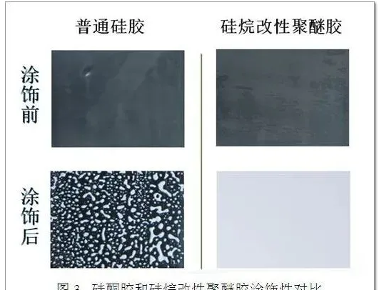 硅烷改性聚醚膠表面可涂飾面漆或涂料,而涂料在硅酮膠表面難以浸潤和鋪展均勻(如圖3所示)。因此有涂飾需求的膠縫,需選用硅烷改性聚醚膠,不能選用硅酮密封膠;無涂飾需求的膠縫,可選用硅烷改性聚醚膠或者硅酮密封膠。