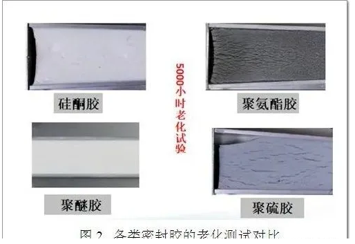 硅烷改性聚醚膠的良好耐候性來源于其分子結構中的Si-O鍵,該化學鍵的鍵能高于紫外線的能量。優異的耐候性充分保證了裝配式建筑膠縫的長久密封與安全。下圖是各類密封膠耐老化性測試的對比,白云牌SMP651裝配式專用硅烷改性聚醚膠產品,在經歷5000h老化后,表面仍無開裂現象(見圖2)。