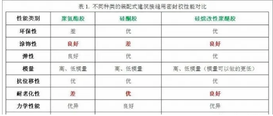 相比于現澆式建筑,裝配式建筑內外墻存在更多拼接縫,這讓建筑防水密封面臨更多的重難點,而密封膠的性能則會直接影響裝配式建筑的防水效果,因此密封膠的選用和施工就顯得至關重要。目前市面上常見的裝配式建筑接縫用密封膠主要有:聚氨酯類、硅酮類、硅烷改性聚醚類等。不同的分子結構決定了各類密封膠的理化性能差異,這里匯總了這三類密封膠的性能對比(表1):