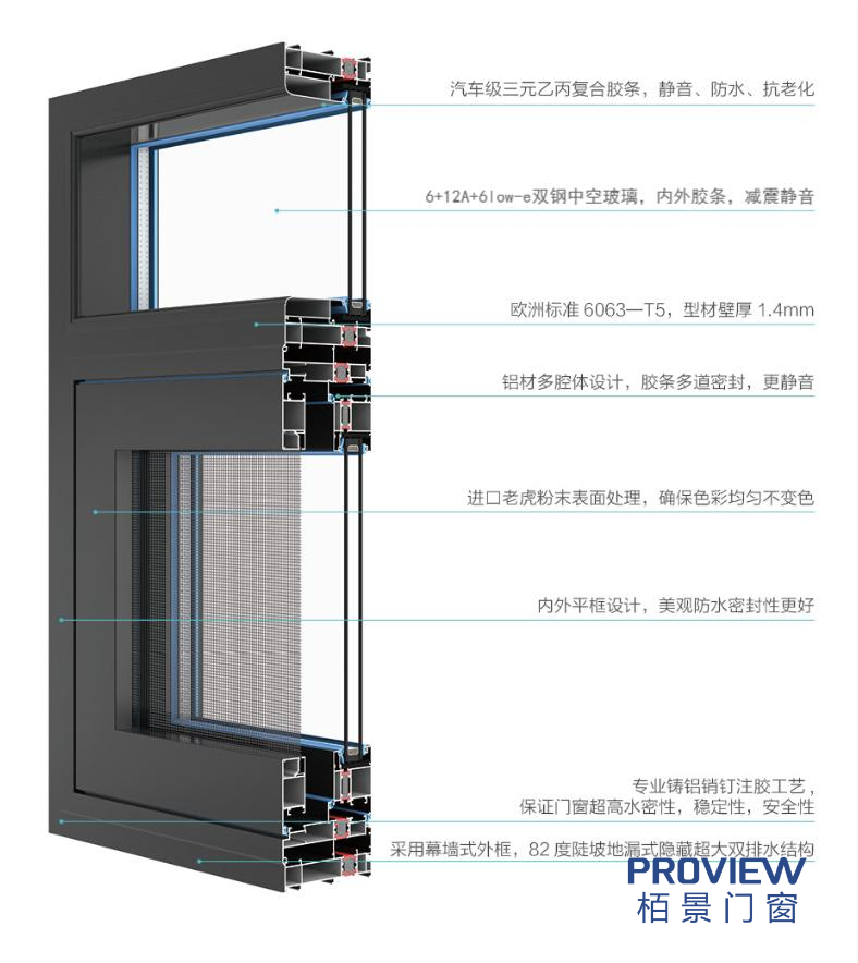 栢景系統門窗將Low-e玻璃作為產品首選配置,高透光低輻射,具有普通玻璃不具備的優質隔熱性能和光學性能。雙層中空Low-e玻璃配合氬氣填充,使得產品隔熱隔音性能更加卓越,能夠為您帶來與眾不同的隔熱效果。