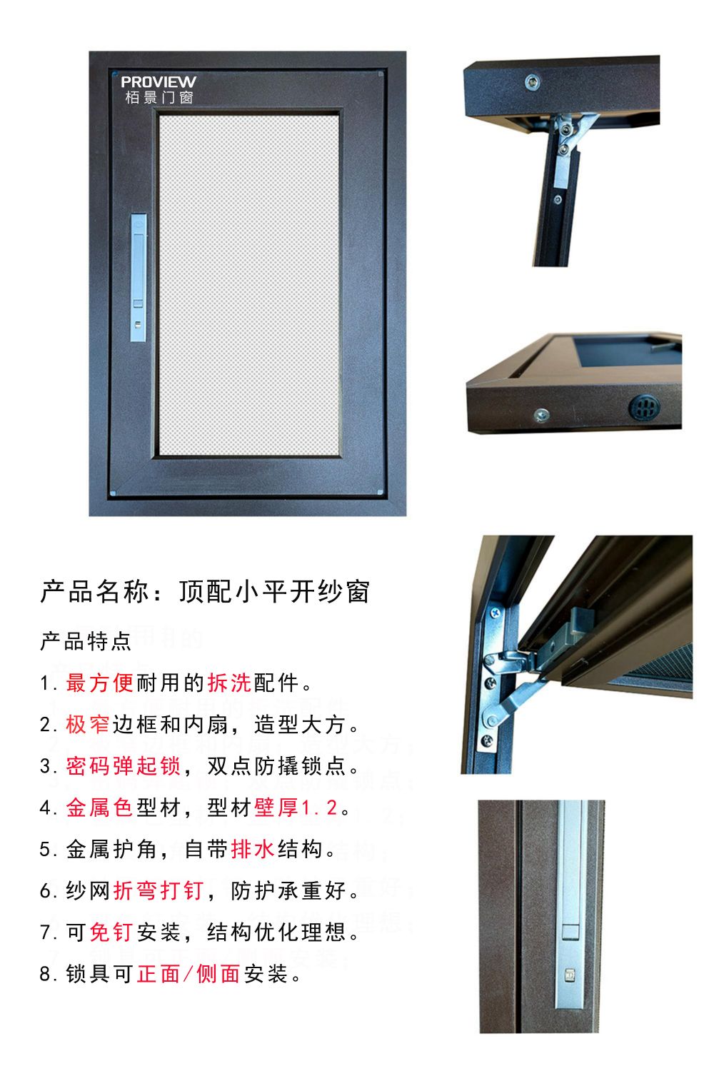 • 外框不銹鋼銷釘組角工藝,外看面無凹槽確保整體性,小邊框設計,不妨礙原窗排水功能。