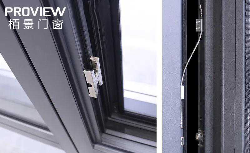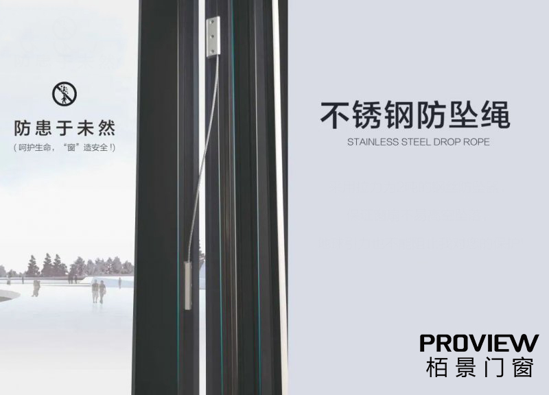 栢景平開窗系列門窗防墜繩采用優質強韌不銹鋼索與防墜器,其承重拉力可以穩穩拖住60KG以上的門窗重物。一繩在“守”,守住安全。